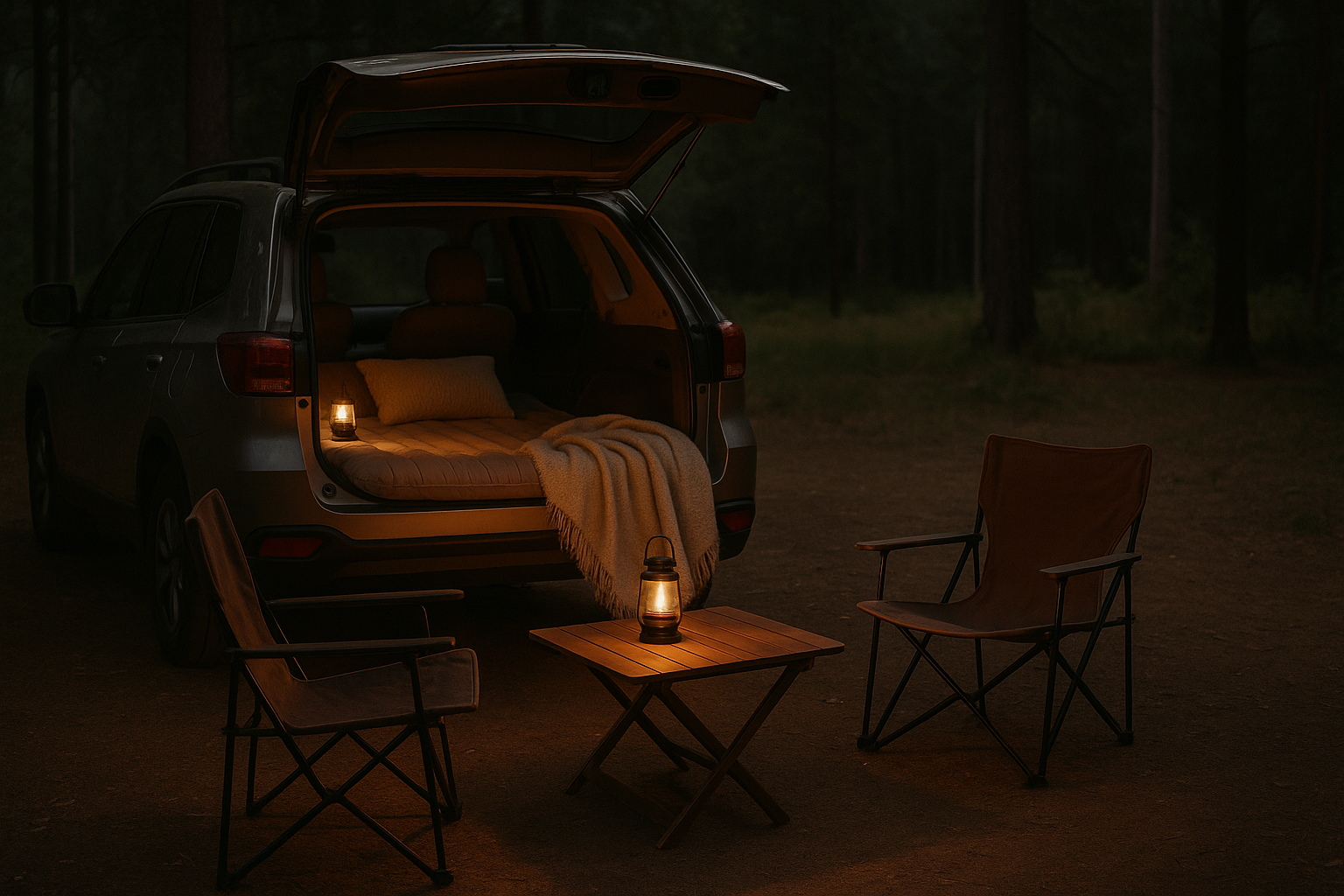 | 4 | 캠핑 테이블 & 체어 | 차 밖에서 식사하거나 쉴 때 필요. 접이식, 경량 제품이 인기. | 폴딩 캠핑 테이블 경량 캠핑 체어 |